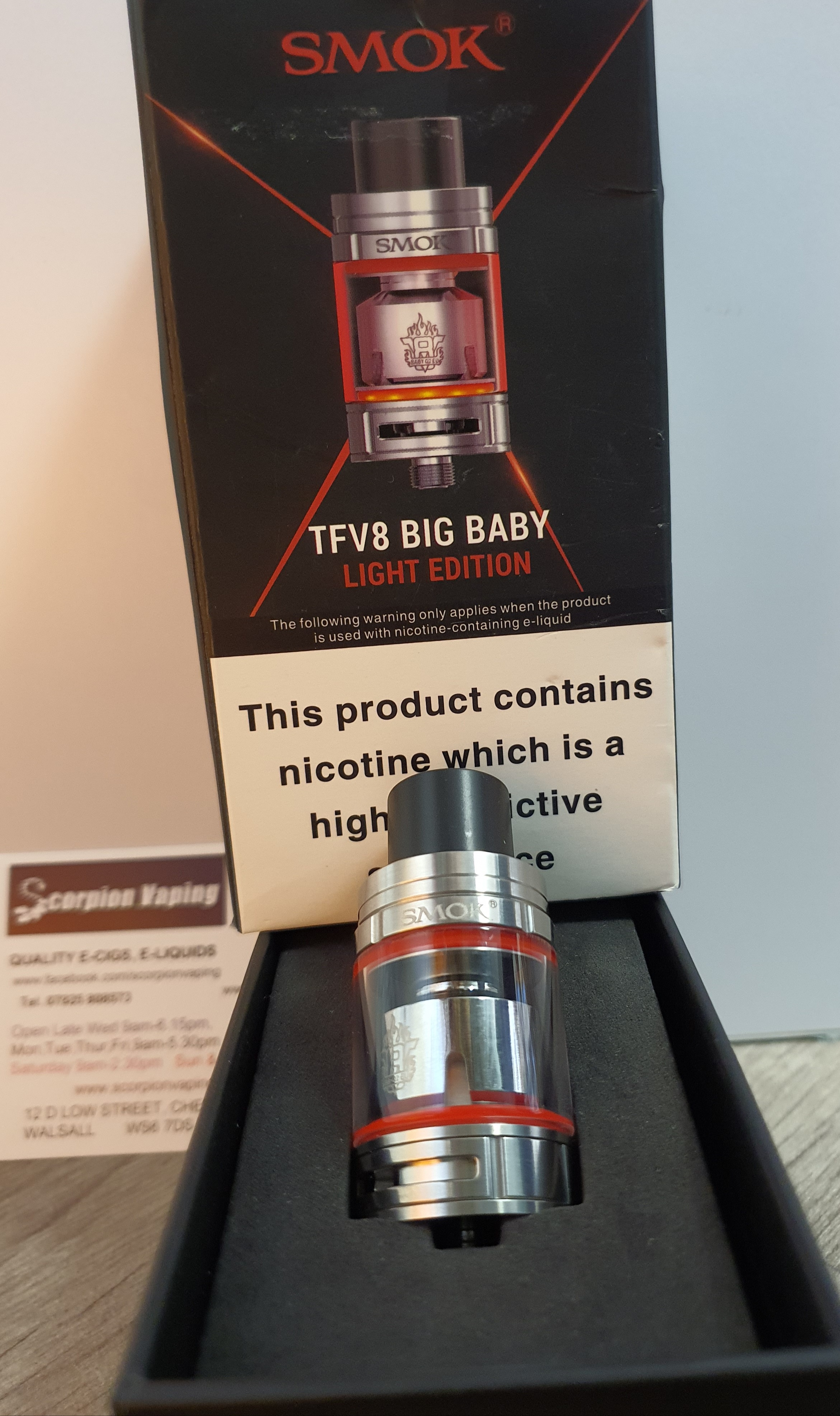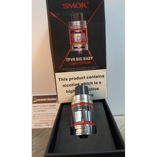SmokTFV8 Big Baby LED Light Edition is an advanced edition of the Big Baby, Just as the name implies, this new version has LED Lights at the base of the tank. When you fire the device to vape, the LED will light up and change it's colour along with the colour of the sealing ring.